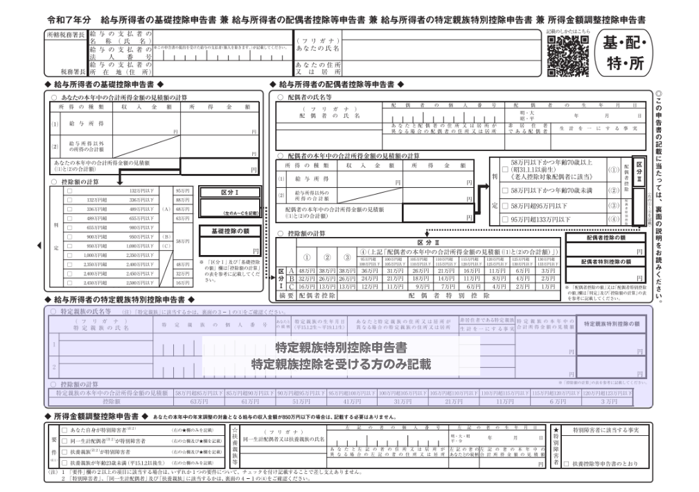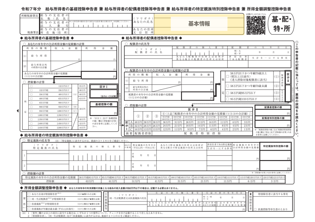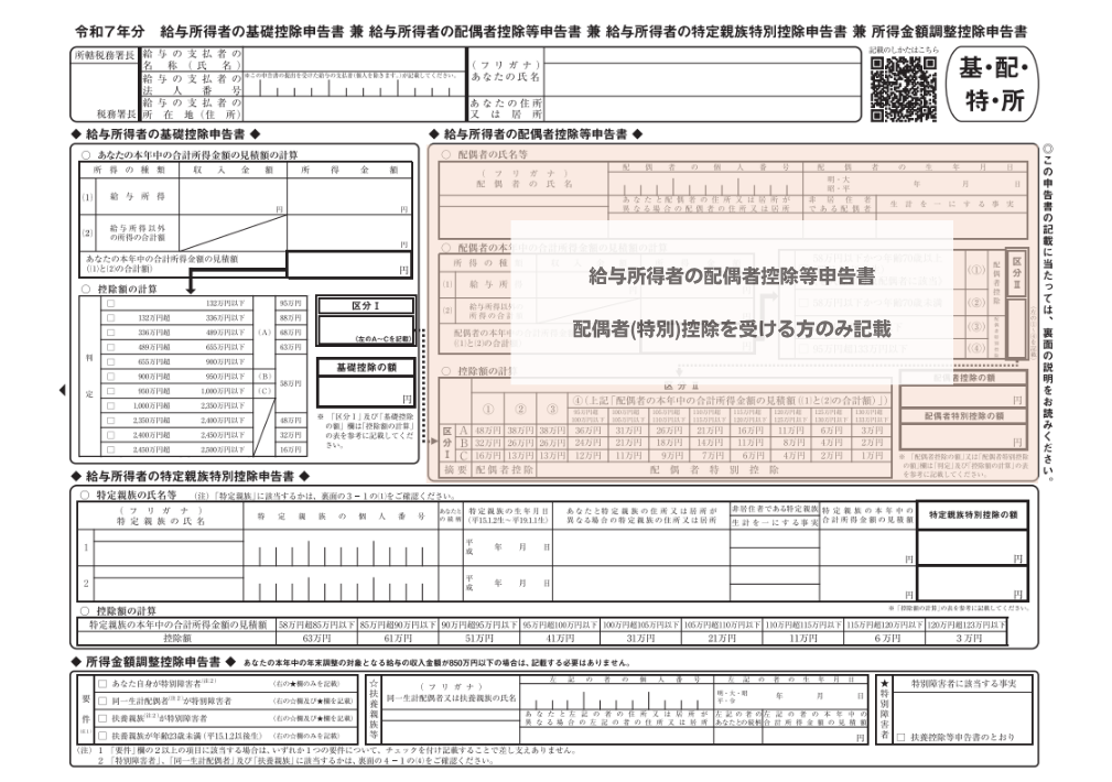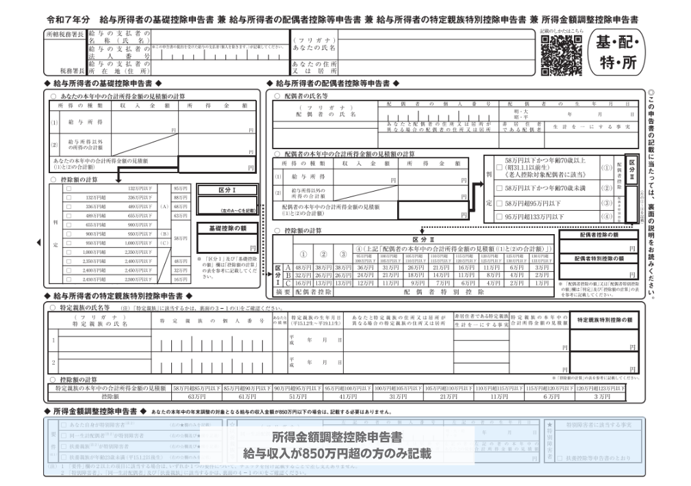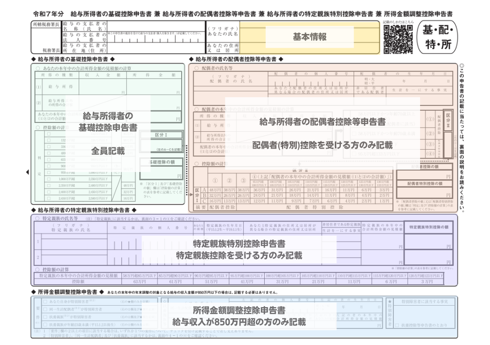 給与所得者の基礎控除申告書兼配偶者控除等申告書兼特定親族特別控除申告書兼所得金額調整控除申告書 の全体像